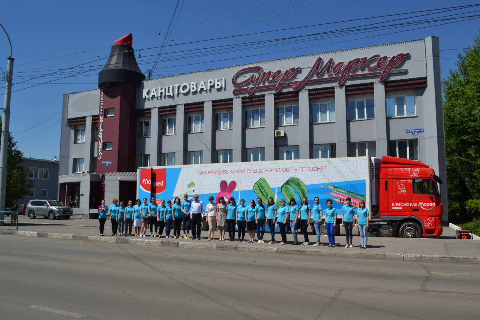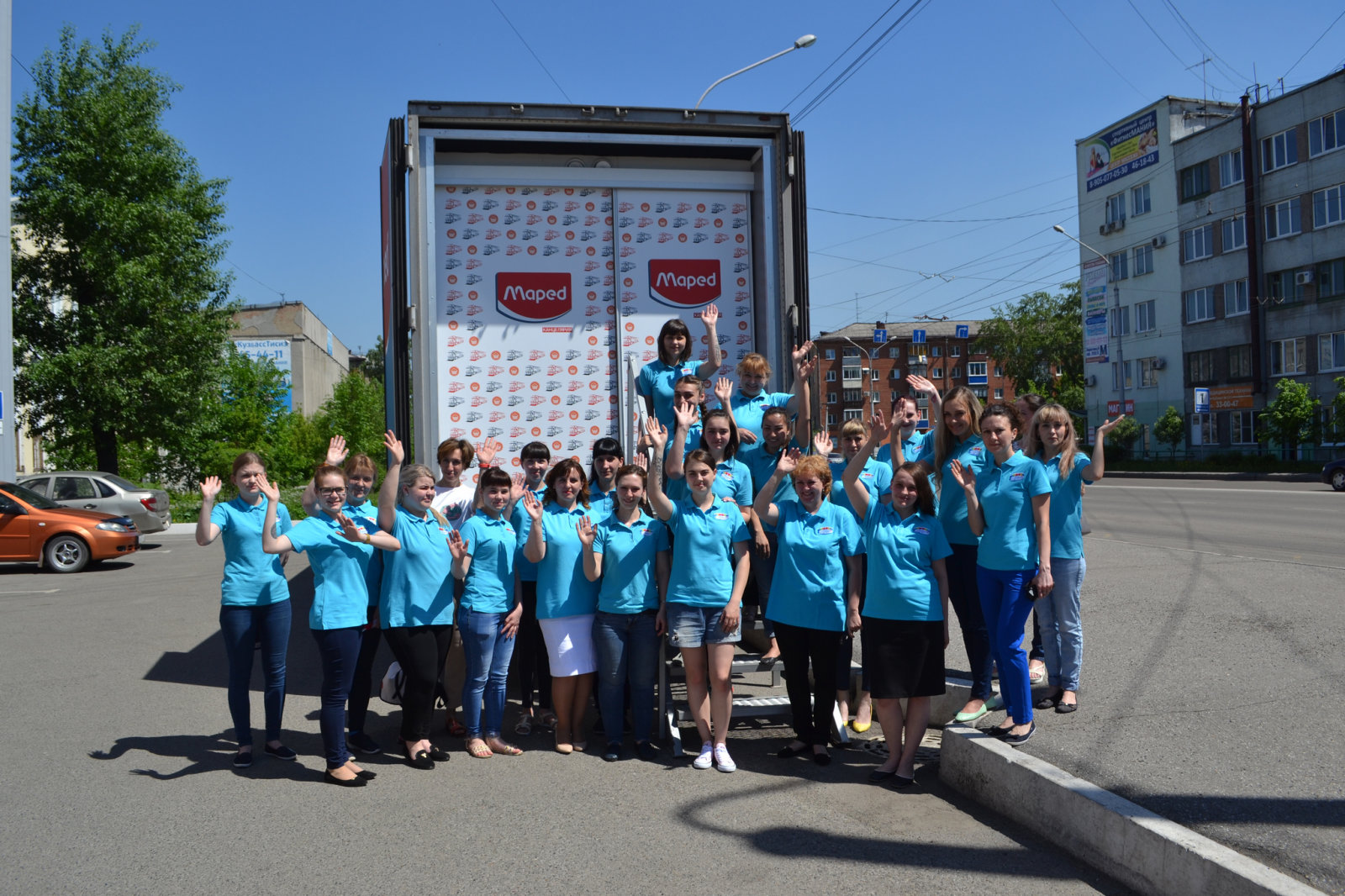 К слову, партнёры всё время на связи. «Акварель» не просто торгует продукцией этого бренда, но и постоянно привлекает компанию «Мапед» к участию в своих Акварельных праздниках. И та всегда откликается с большим удовольствием. А на позапрошлую Пасху в Новокузнецк прилетел генеральный директор «Мапед Рус» Николя Финк, чтобы провести переговоры и лично побывать в Акварельных магазинах, а заодно поздравить победителей И вот новый необычный формат общения – компания его придумала для более близкого контакта с регионами. Но длинномер «не резиновый», поэтому 45 сотрудников компании из 10 городов Кемеровской области присутствия «Акварели» разбиваются на две смены, чтобы каждый сумел чему-то поучиться и, конечно, пообщаться с гостями, так долго добиравшимися до Новокузнецка. Но сначала все фотографируются на фоне эффектного экспо-трака. И при виде такого количества представительниц прекрасного пола в заметных издали фирменных Акварельных майках, водители проезжающих машин начинают приветственно сигналить. По удобной лесенке в красочный длинномер заходят симпатичные девушки и женщины, от которых напрямую зависит, что именно будет находиться в пакете, с которым очередной покупатель уйдёт из магазина домой. Причём он, вполне возможно, просто забежал в «Акварель» за новой точилкой, потому что старая, как обычно, куда-то задевалась! | |||