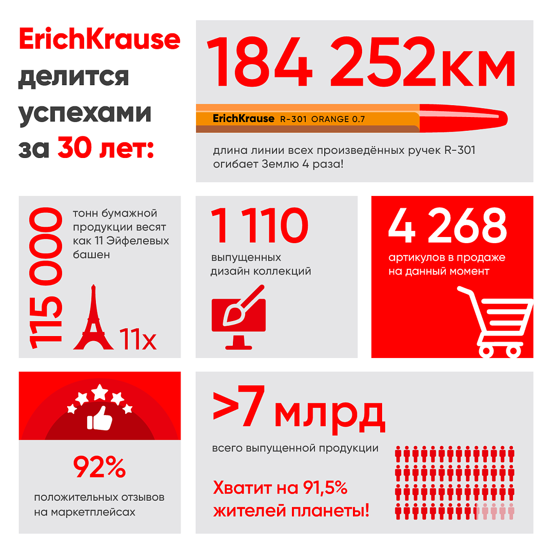 В этом году бренд ErichKrause отмечает знаменательную юбилейную дату – 30 лет! За три десятилетия мы прошли путь от молодого игрока с первыми моделями шариковых ручек и школьными тетрадями до лидера на рынке канцелярии с широчайшим ассортиментом товаров, которые помогают учиться, работать и творить, оставляя яркий след в истории российского и мирового образования и творчества.