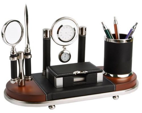 При взгляде на этот настольный прибор сразу становится понятно: он не зря назван в честь известного французского философа и математика Рене Декарта. Благодаря своему строгому и одновременно оригинальному дизайну, этот сувенир отлично подойдет для людей, ценящих точность и при этом нечуждых философских размышлений. А функциональность набора (в него вошли часы, термометр, подставка под ручки, лупа и нож для бумаг) делает его незаменимым помощником в офисной работе.