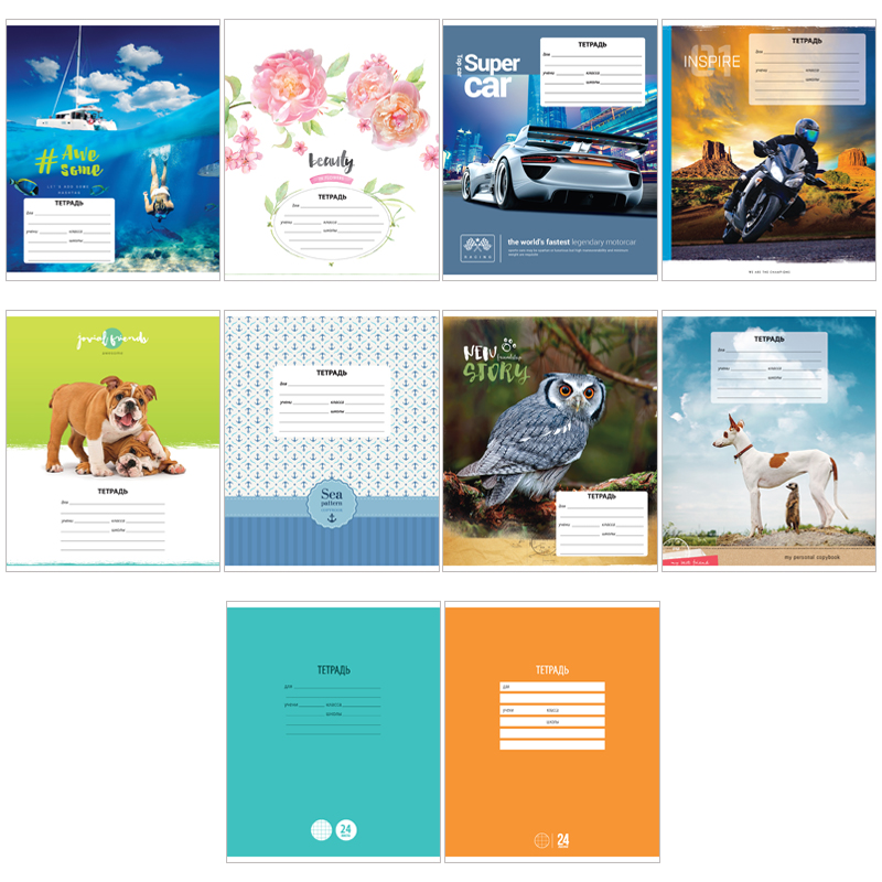 Обложки тетрадей представлены в разнообразных решениях, которые понравятся и девочкам, и мальчикам. Коллекции отражают множество тем: путешествия, животные, птицы, футбол, авто, узоры и графические рисунки, морская тема и многое другое. Так же есть и универсальные однотонные классические тетради.