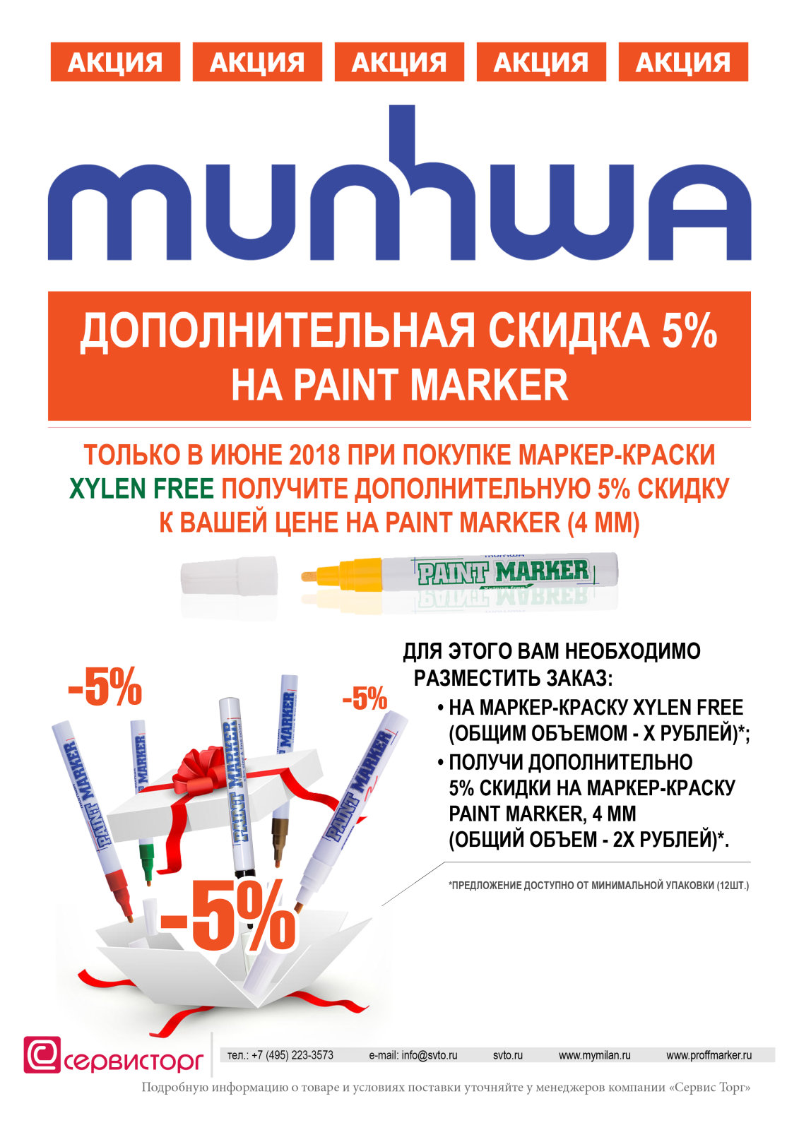 Только в июне 2018 у Вас есть возможность получить дополнительную 5% скидку к Вашей цене на маркер-краску TM Munhwa! Успейте купить маркер-краску на выгодных условиях!