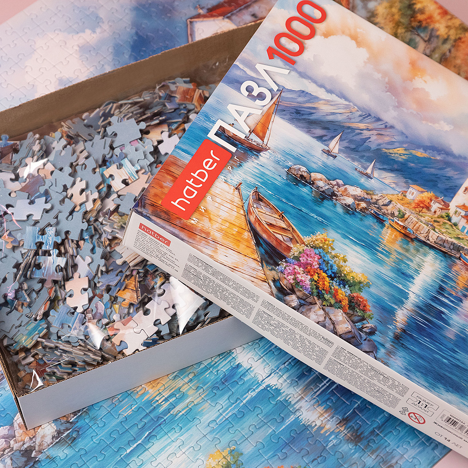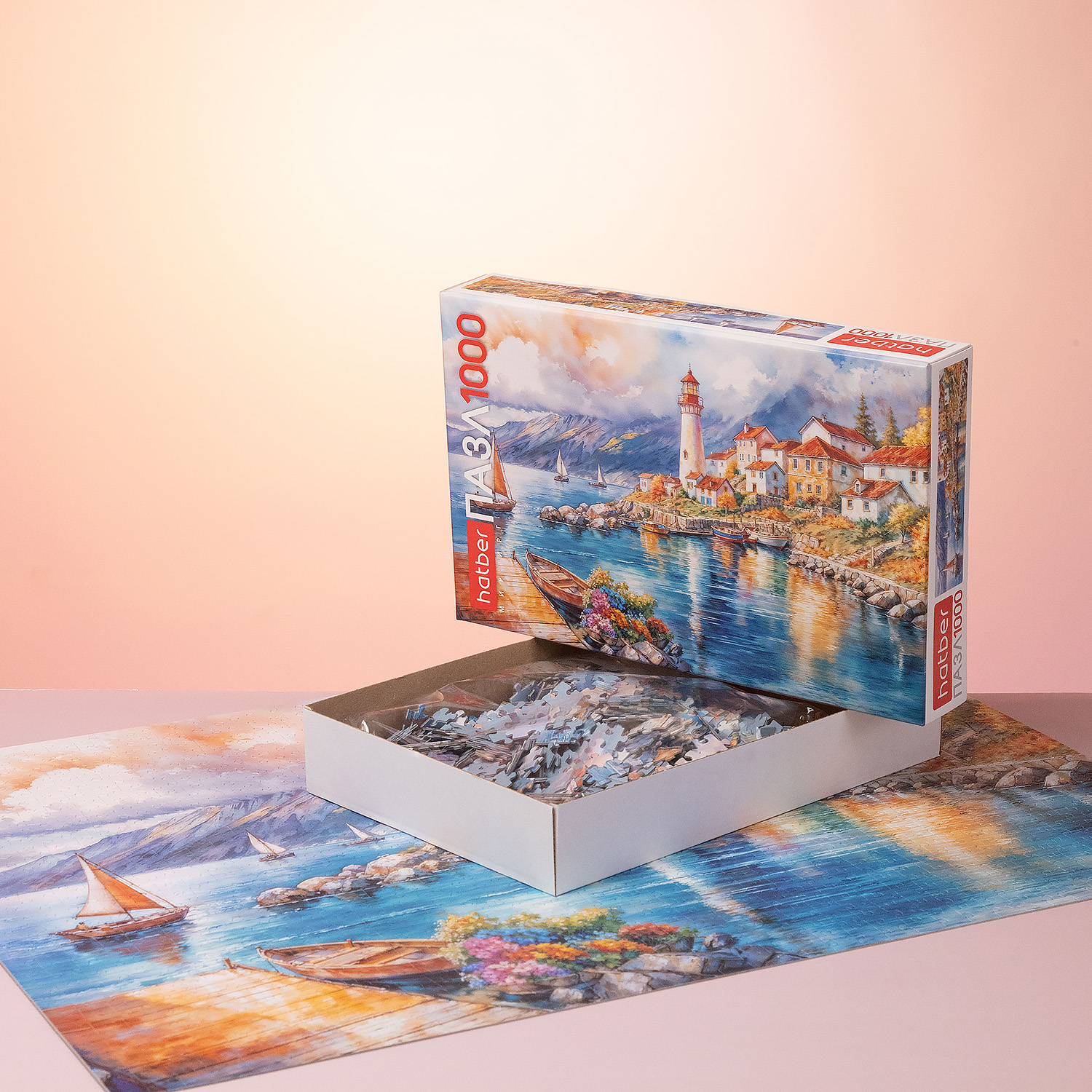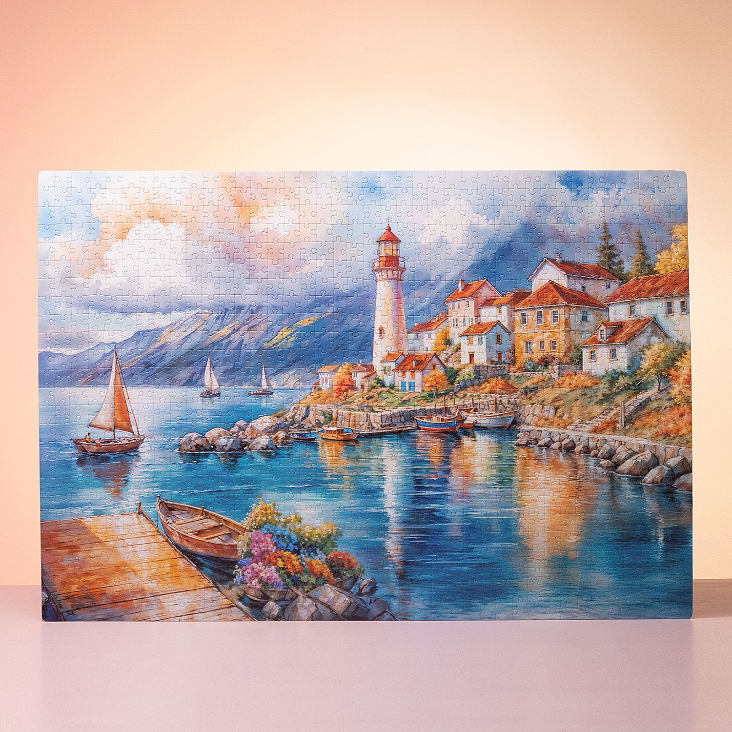 На иллюстрации — прибрежный городок с маяком: спокойная бухта, лодки у берега, каменные домики с тёплыми крышами и горы на линии горизонта. Яркие, но гармоничные цвета воды, неба и архитектуры создают ощущение солнечного дня. В картине много «точек интереса» для сборки: отражения в воде, камни, цветы на переднем плане, паруса вдали. Это делает процесс разнообразным и превращает готовый пазл в эффектное панно, которое гармонично смотрится в интерьере.