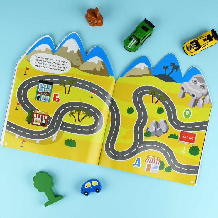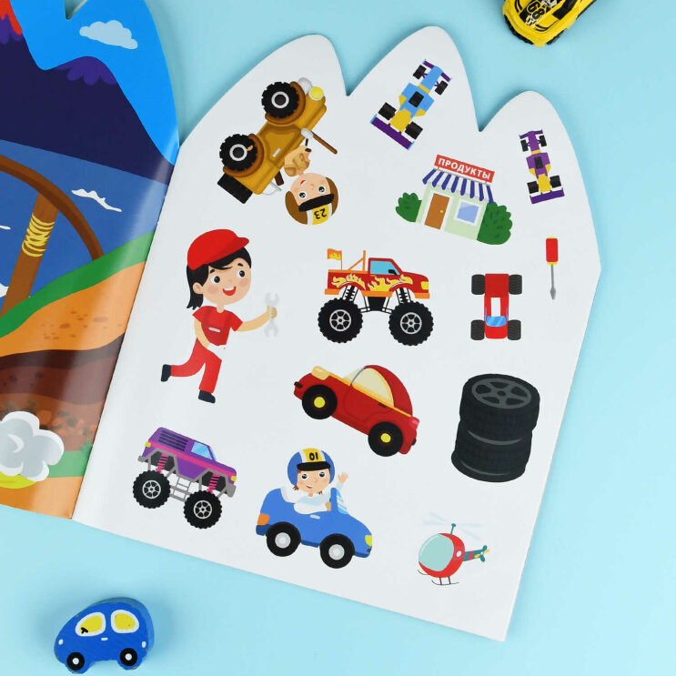 Книжка-картинка для детей. Серия «Книжка с наклейками» арт. 72150 КРУТЫЕ ГОНКИ /200х260 мм, 6 л., блок - бумага мелованная 115 г/м², полноцветная печать, обл - мелованный картон 200 г/м², мягкий переплёт (2 скобы), вырубка/