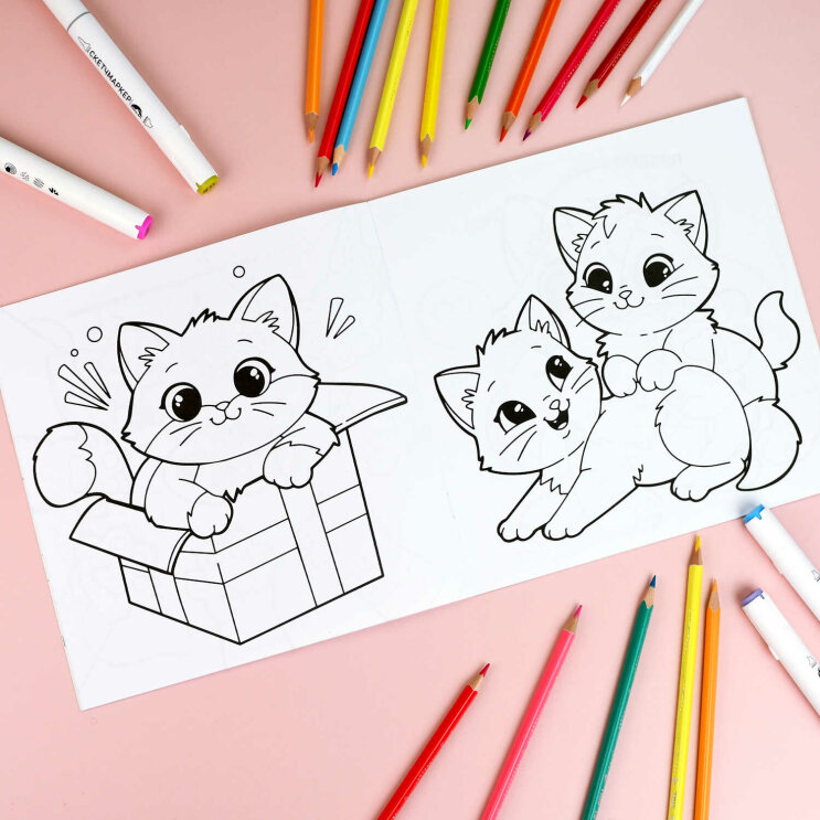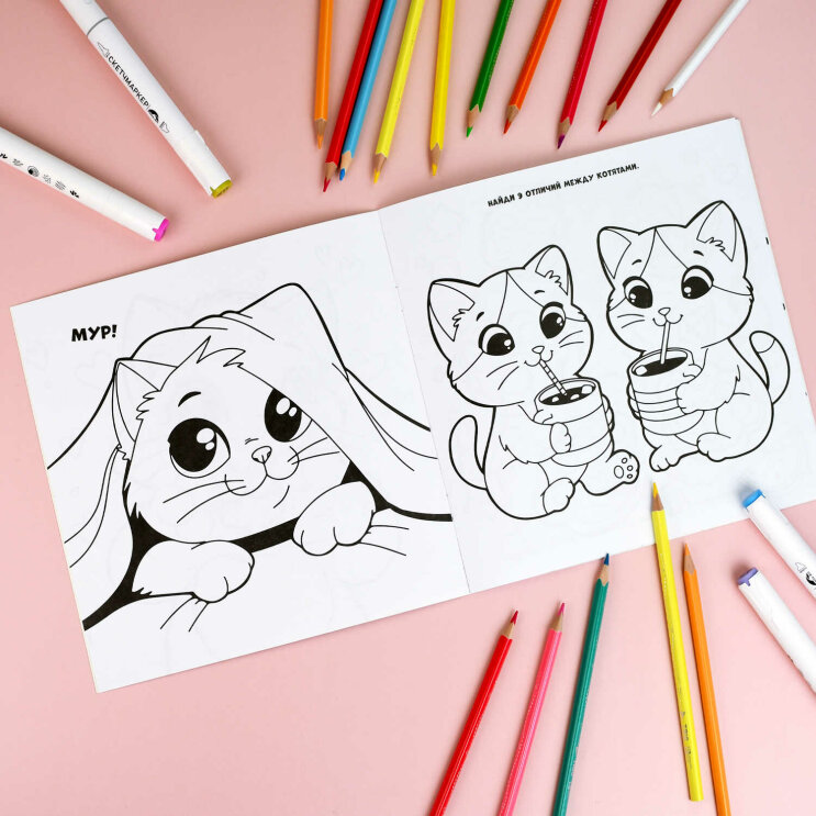 Книжка-раскраска для детей "У меня лапки" арт. 71055 МИЛЫЕ КОТИКИ /215x215 мм, 8 л., блок - офсет 100 г/м², печать в одну краску, обл - мелованный картон 200 г/м², выборочный УФ-лак, мягкий переплёт (2 скобы)