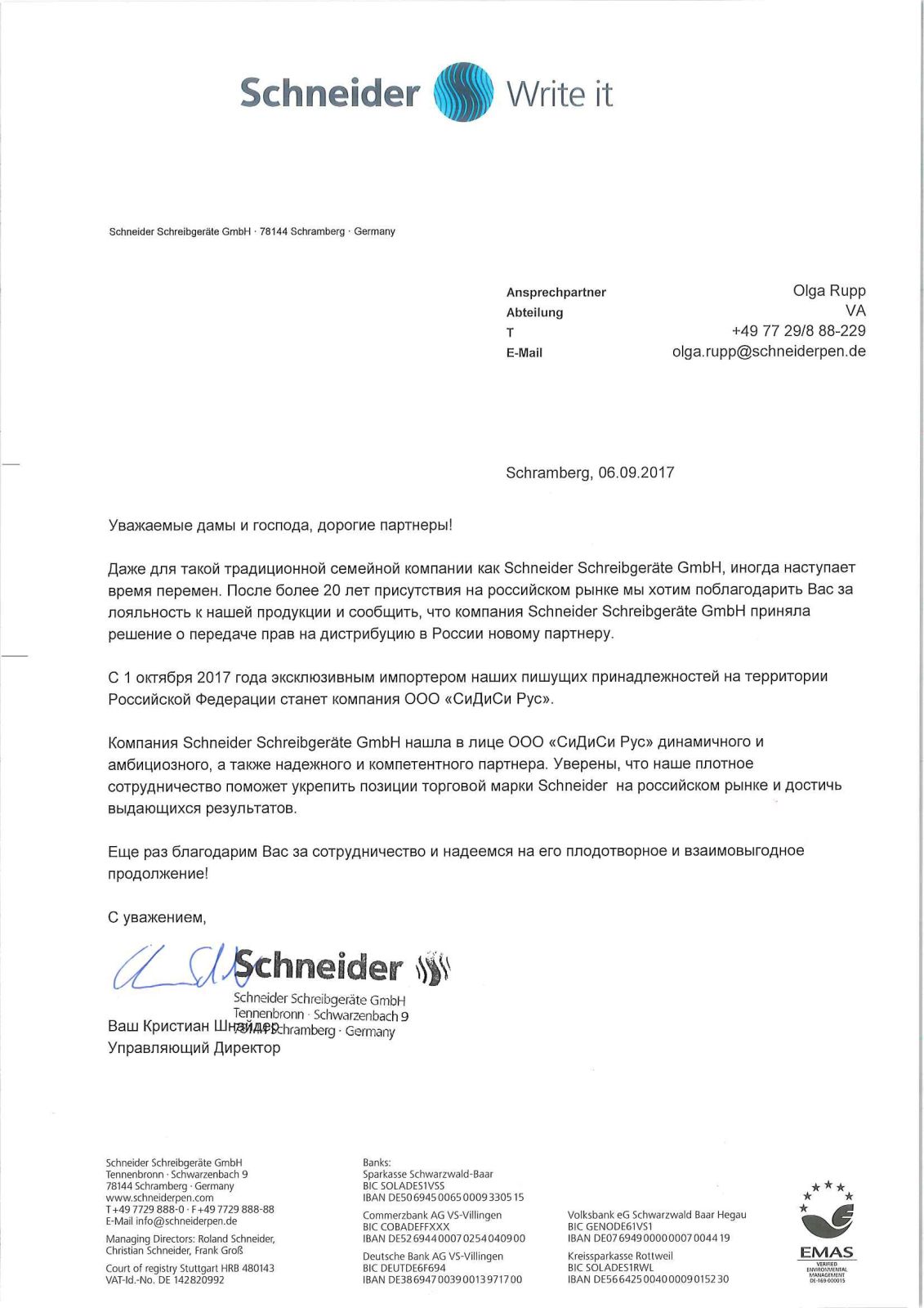 Компания Schneider Schreibgeräte GmbH приняла решение о смене дистрибьютора в России.
