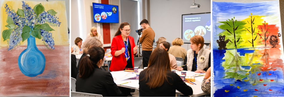Обсуждение продолжилось на мастер- классе. Юлия Сергеевна рассказала о том, чем отличаются разные материалы и поделилась идеями, как через творчество развивать эмоциональный интеллект и речь. Педагоги рисовали гуашью, осваивали пластилинографию и особенности других техник. А также познакомились с новинками серий «Кроха», «Классика цвета», ZOO и «Школа Творчества».