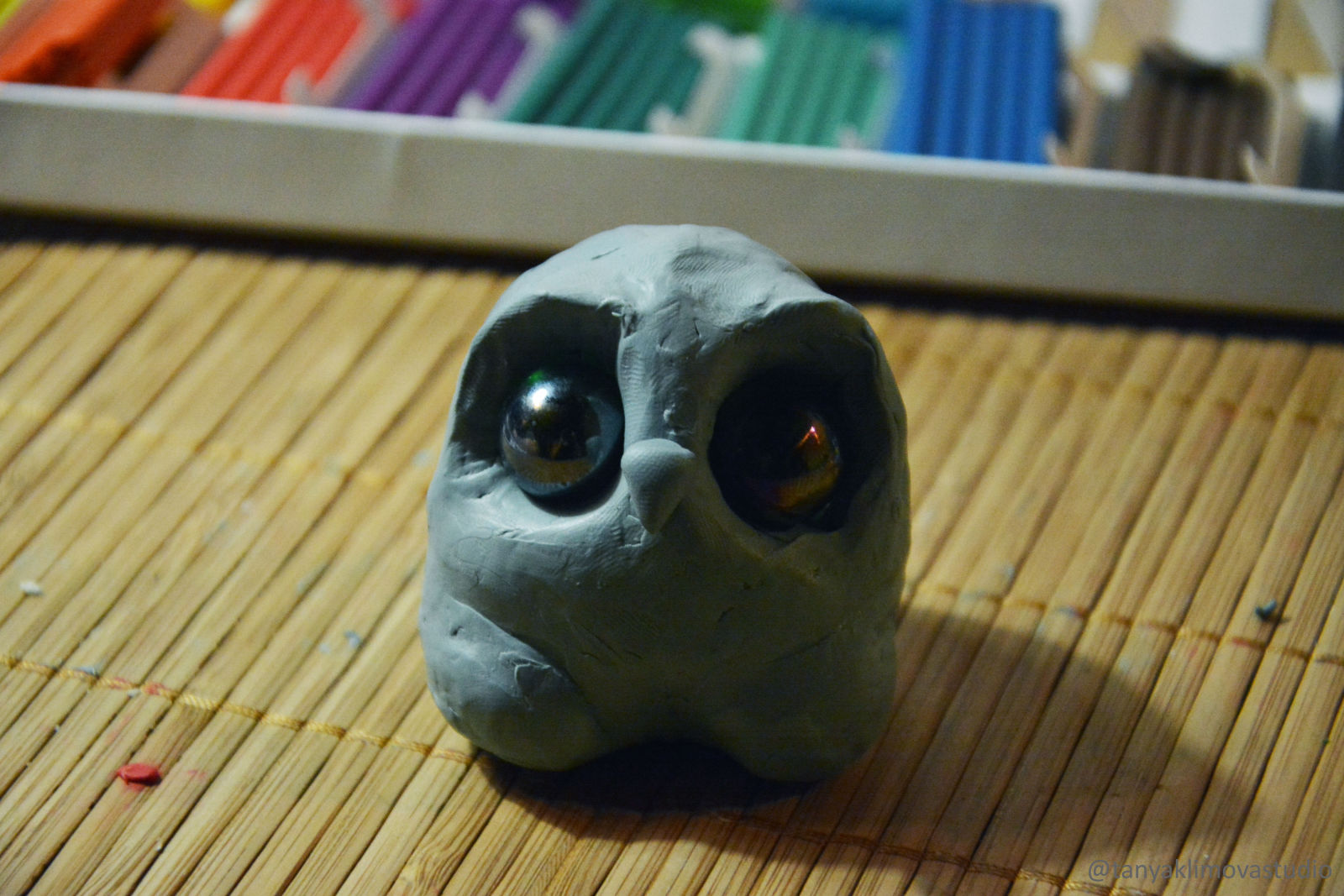 Из этого кусочка будем делать перья. Берем маленький кусочек серого пластилина, лепим шарик |