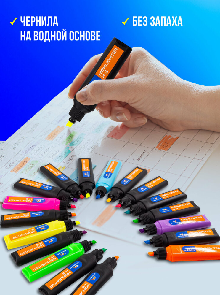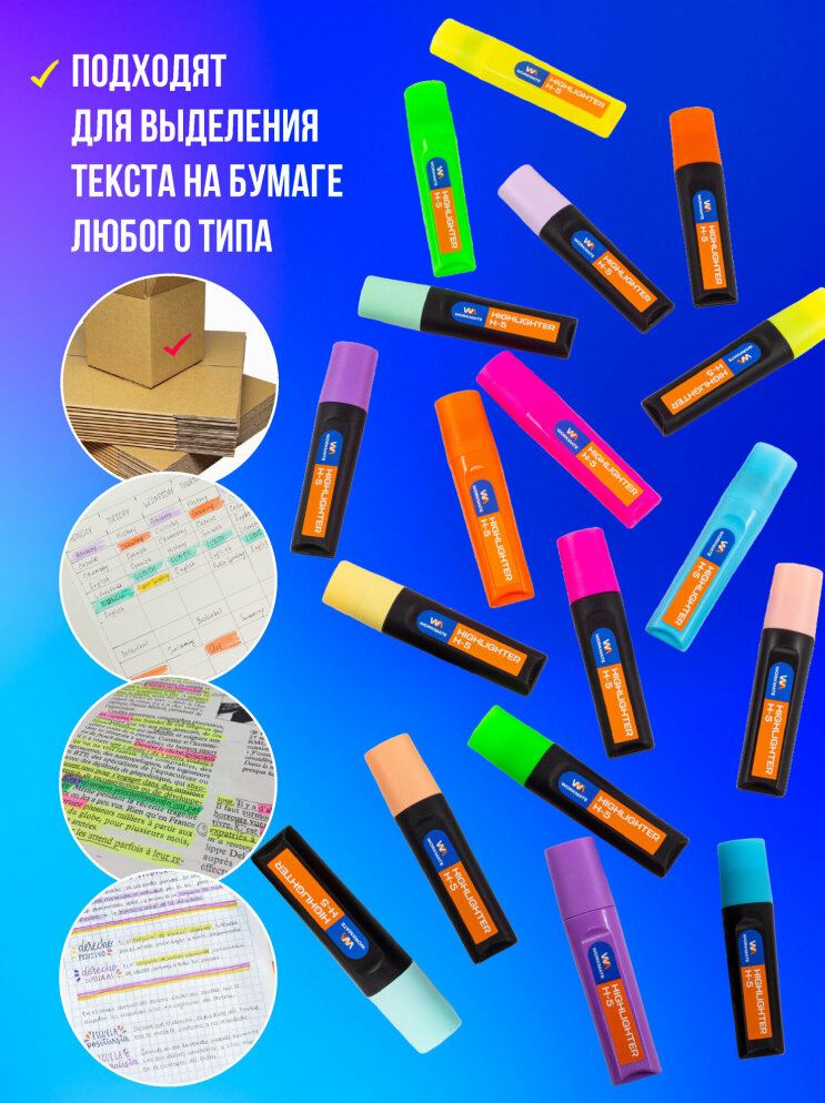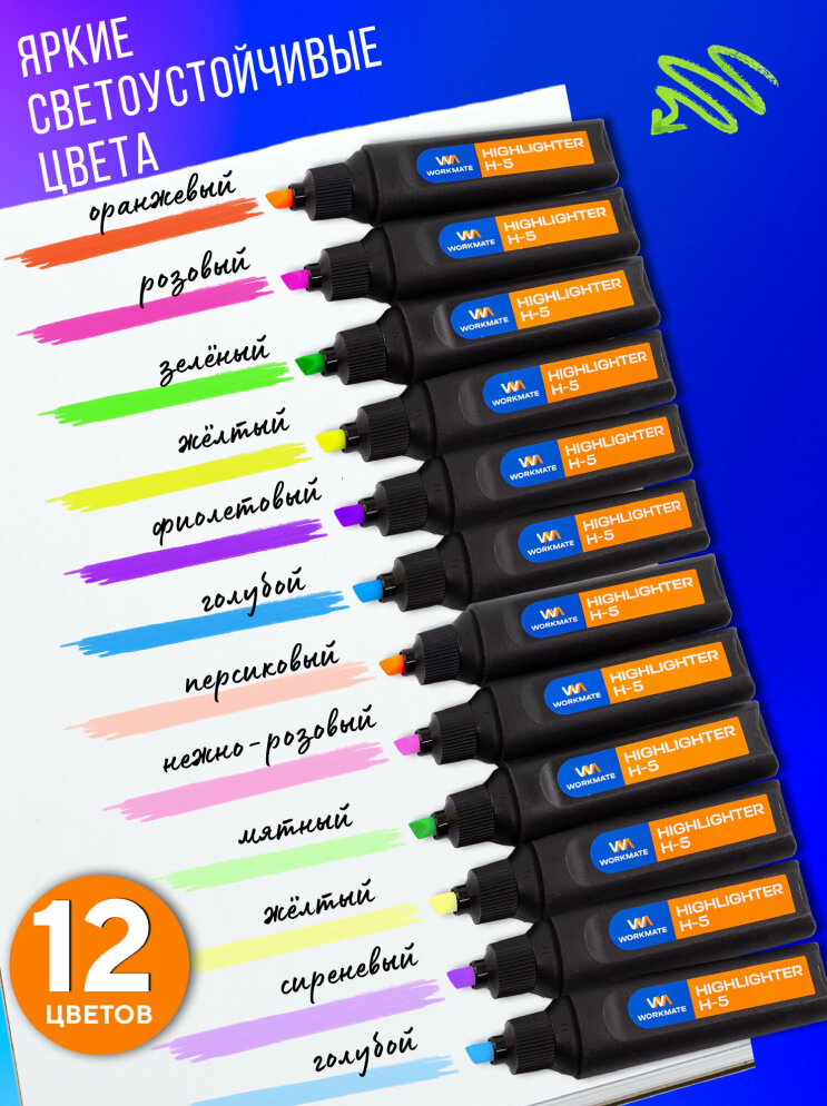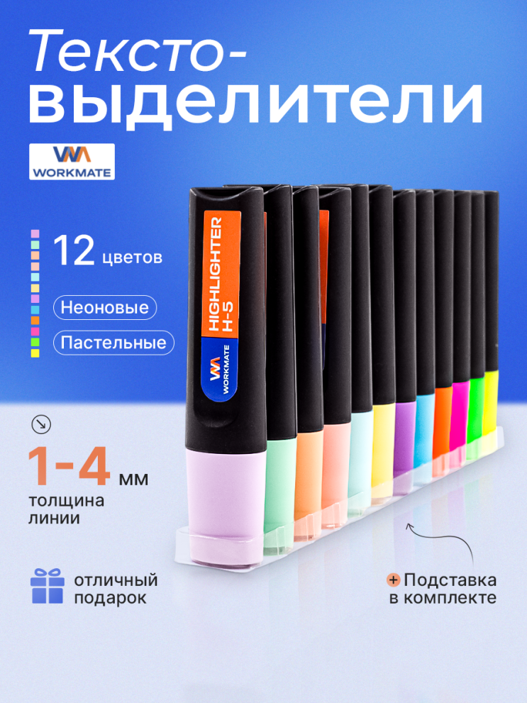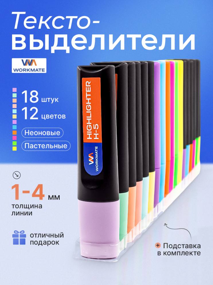 Наборы текстовыделителей Workmate H-5 в ПВХ-пенале, толщина линии 1-4 мм, радуга неоновых и пастельных цветов позволит выделить разными цветами те части текста в документах, на которые нужно обратить внимание.