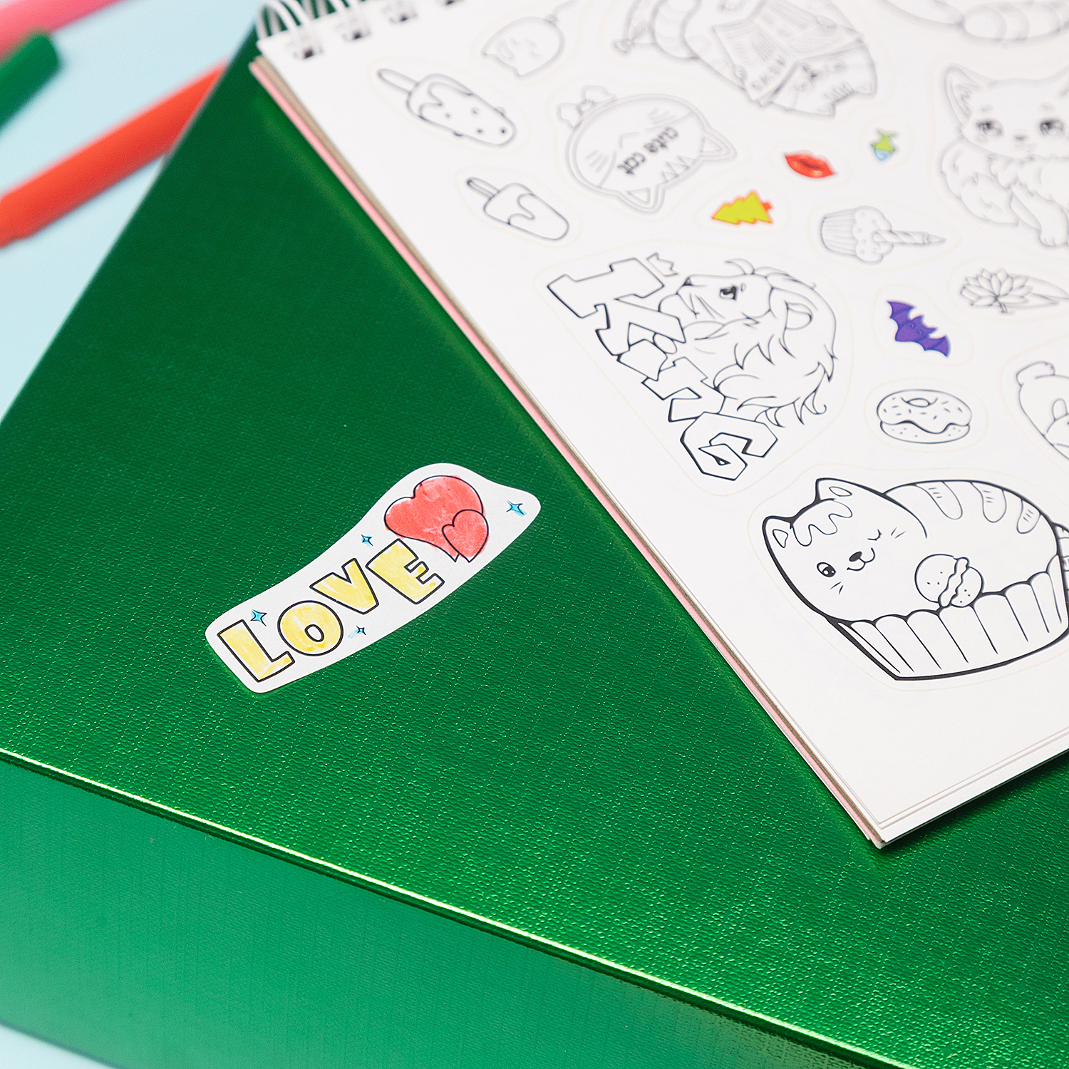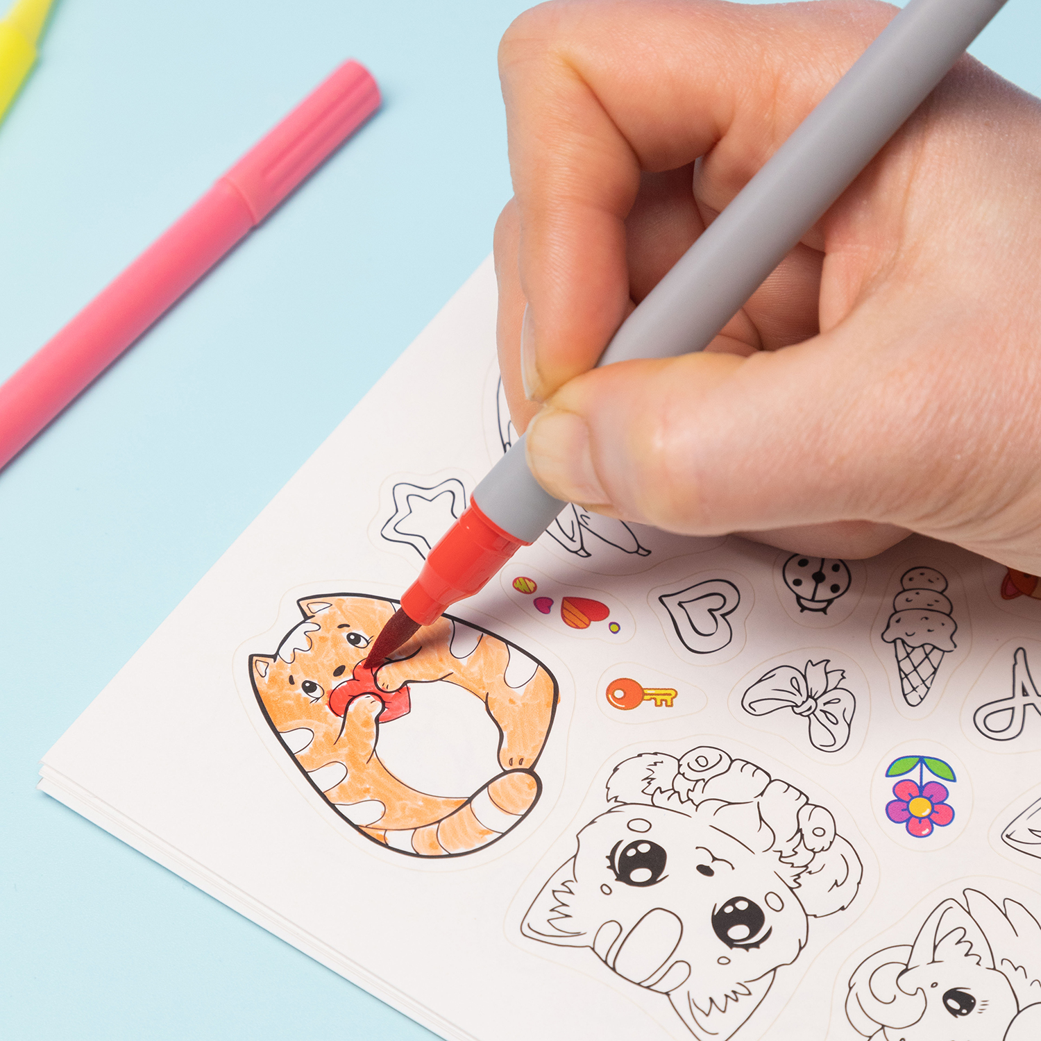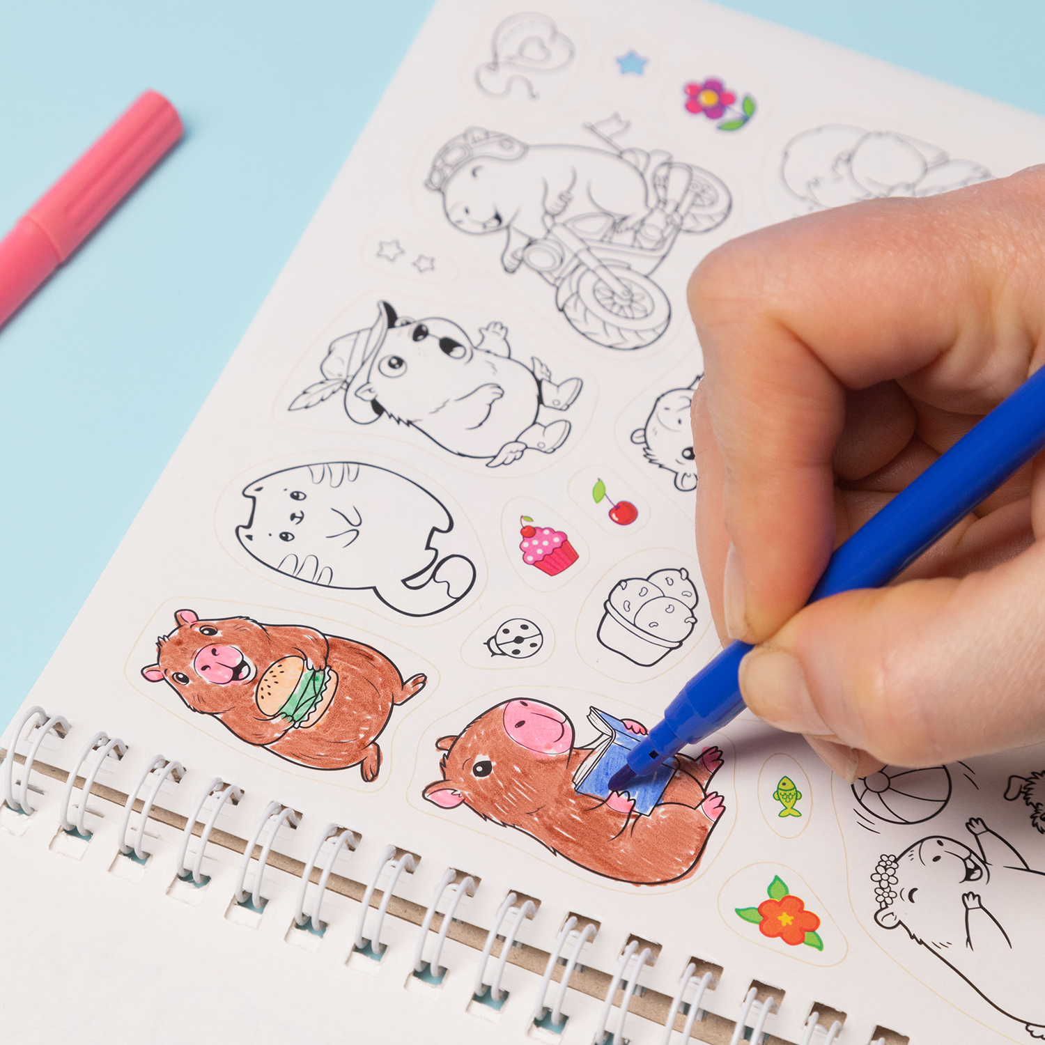 Благодаря плотной картонной подложке и скреплению на гребне процесс раскрашивания становится максимально комфортным — можно творить даже без стола, держа стикербук в руках на весу.