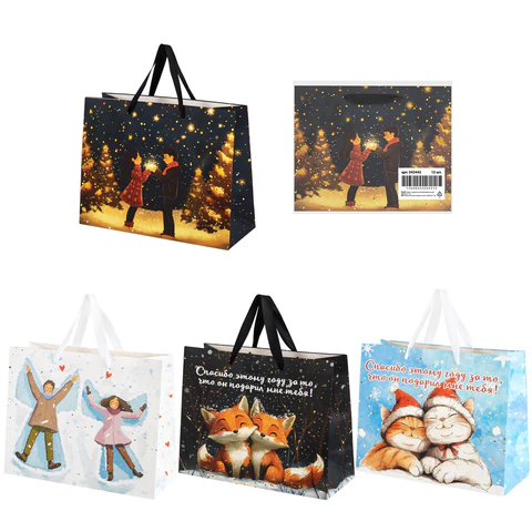 Пакет изготовлен из из ламинированного мелованного картона, снабжен ленточными ручками из полиэстера. Размер – 26х13х32 см. Пакеты украшены милыми иллюстрациями в зимней тематике, которые создают теплые образы, атмосферу любви и уюта. Такой рисунок добавляет романтическое настроение и делает пакет идеальным не только для Нового года, но и для Дня святого Валентина. С лицевой стороны пакета некоторые детали покрыты тиснением золотистой и серебристой фольгой.
