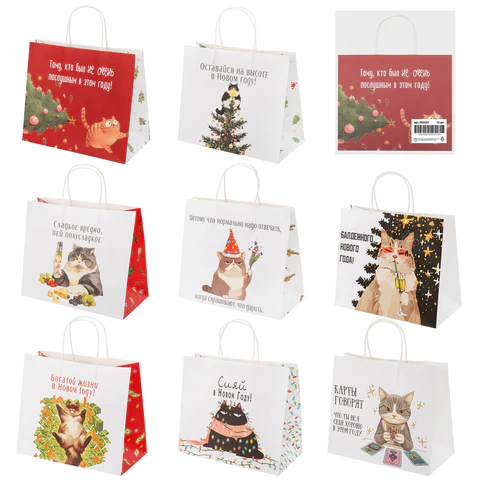 Подарочный новогодний пакет изготовлен из крафт-бумаги, снабжен бумажными ручкам. Размер – 28х14х24 см. На пакете изображены забавные иллюстрации котиков в новогодней тематике и смешные надписи (ассорти без возможности выбора), которые точно вызовут улыбку.