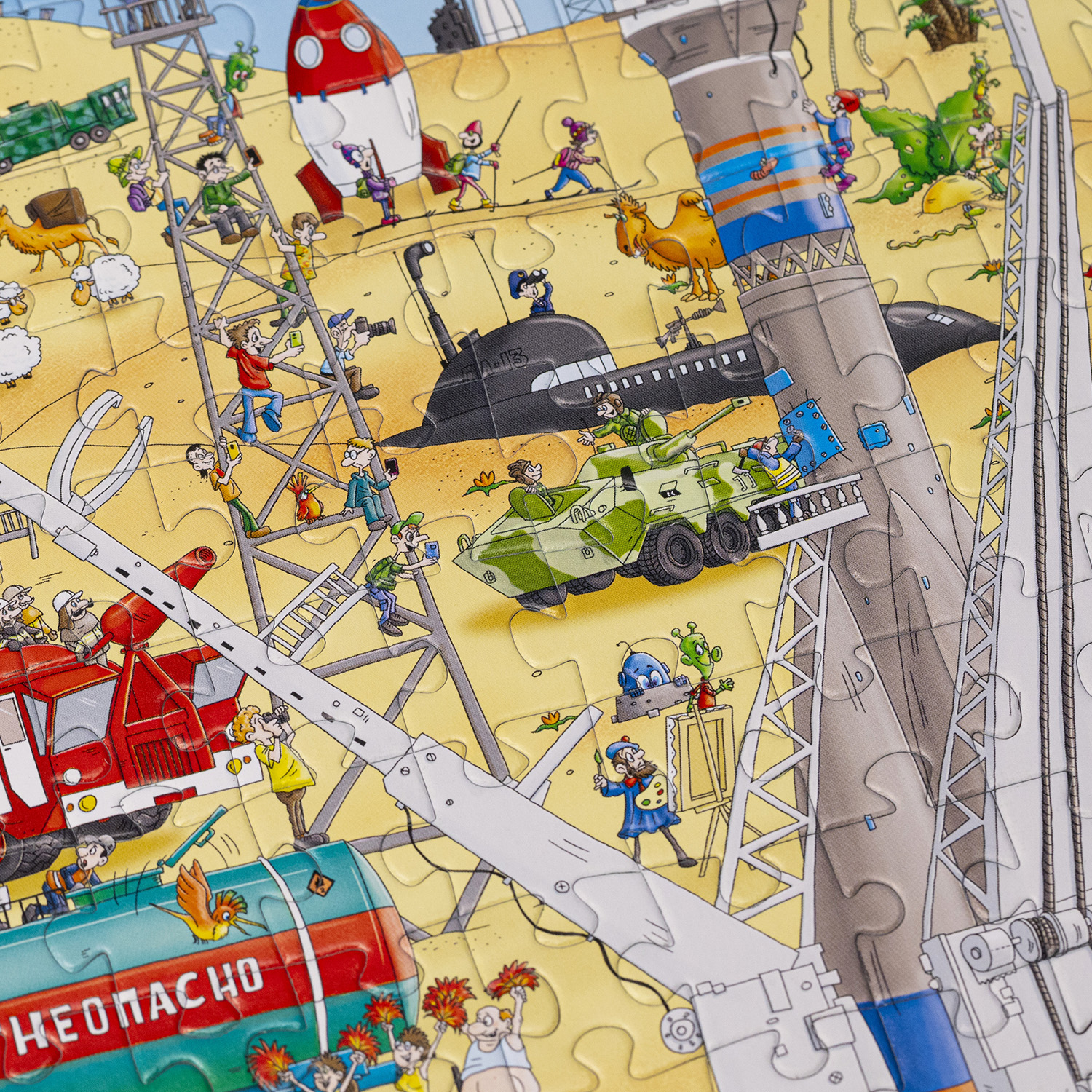 Пазл «Космодром» — это 160 деталей космического хаоса, из которых складывается целый стартовый комплекс: ракеты, вертолёты, пожарные машины, учёные, инопланетяне и ещё пара десятков персонажей, у каждого явно «своя миссия».