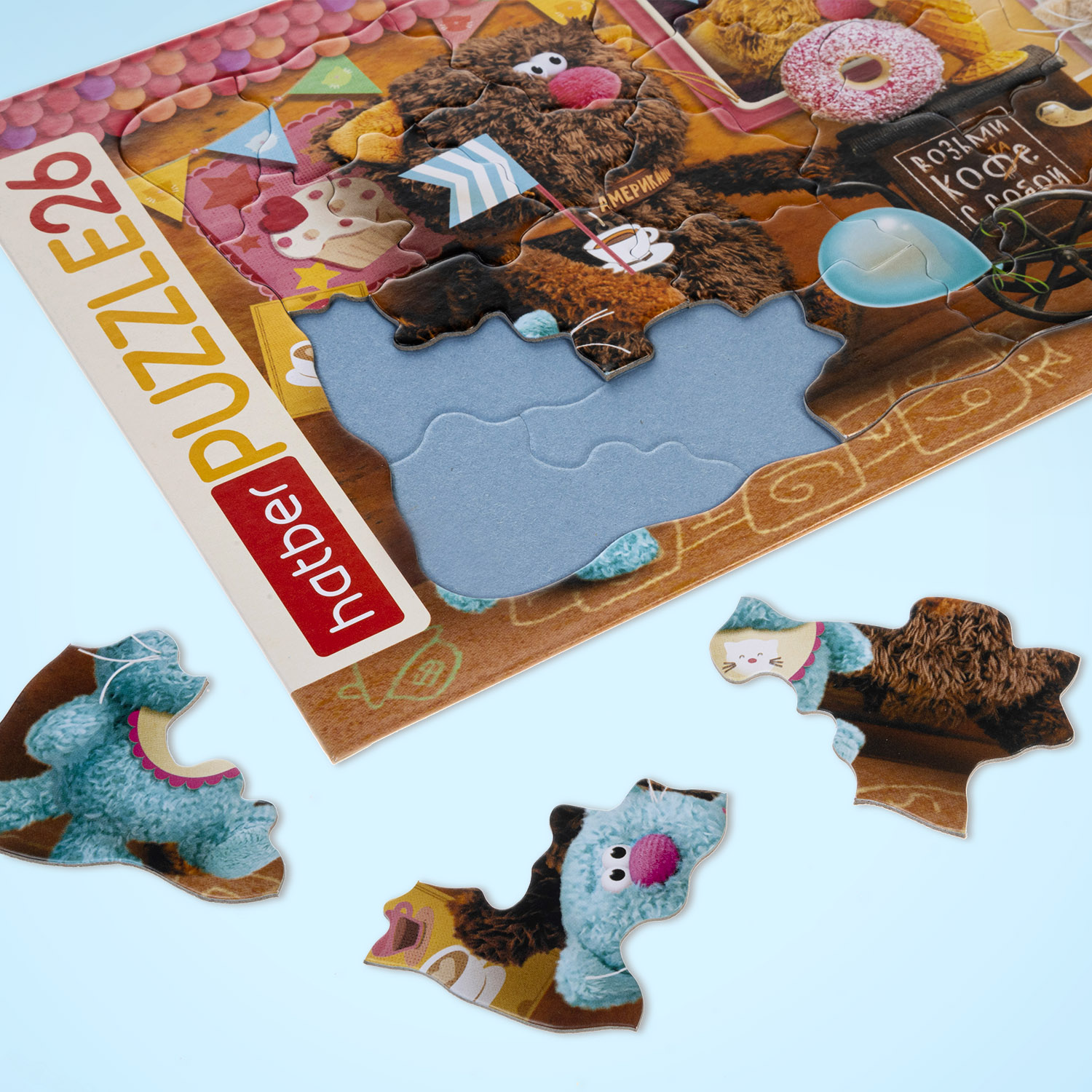 Плюшевые коты, пончики, мороженое и шарики превращают картинку нового пазла в весёлую кофейню, где за стойкой работают мягкие и очень дружелюбные бариста. Яркий сюжет сразу цепляет внимание: один кот держит кружку кофе, другой позирует с огромным пончиком, рядом малыши‑игрушки и праздничные гирлянды на тёплом фоне.