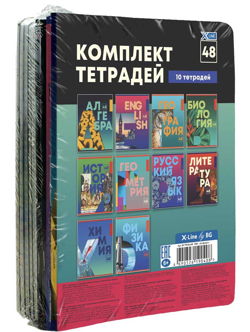 Серия предметных тетрадей А5 скоба 48л. "Алфавит" (10 шт. в упаковке) представлена в виде комплекта (артикул: ТПК5ск48 5881) и россыпью: