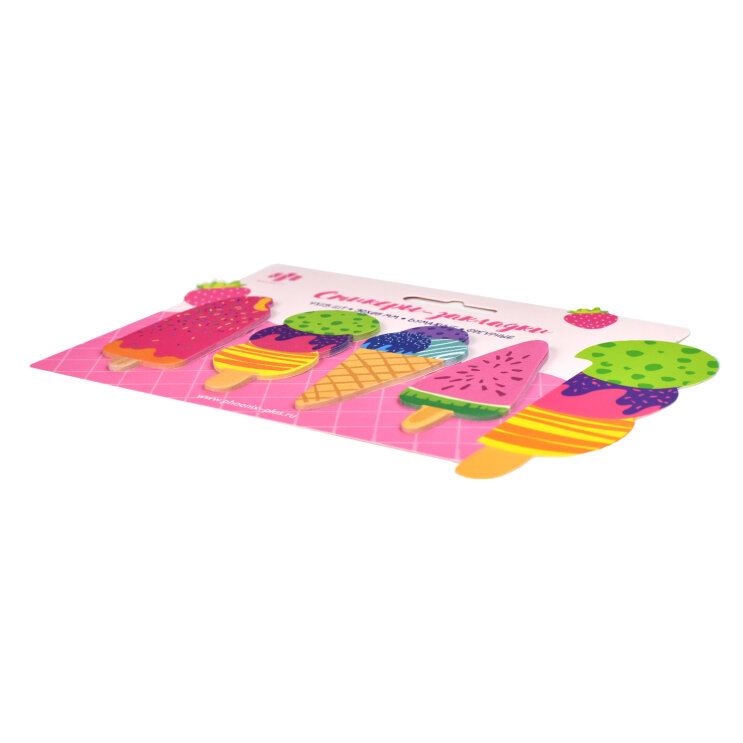 Стикеры-закладки бумажные, 30x65 мм, 60 шт., арт. 66588 / 25 МОРОЖЕНОЕ (материал: дизайнерская бумага 80 г/м², цвет: зелёный, оранжевый, розовый; кол-во цветов: 4, кол-во каждого цвета: 15, форма: фигурная, декор: полноцветная печать; наличие диспенсера: нет, особенности: фигурная вырубка; индивидуальная упаковка: подложка с европодвесом из мелованного картона + ПЭТ-пакет)