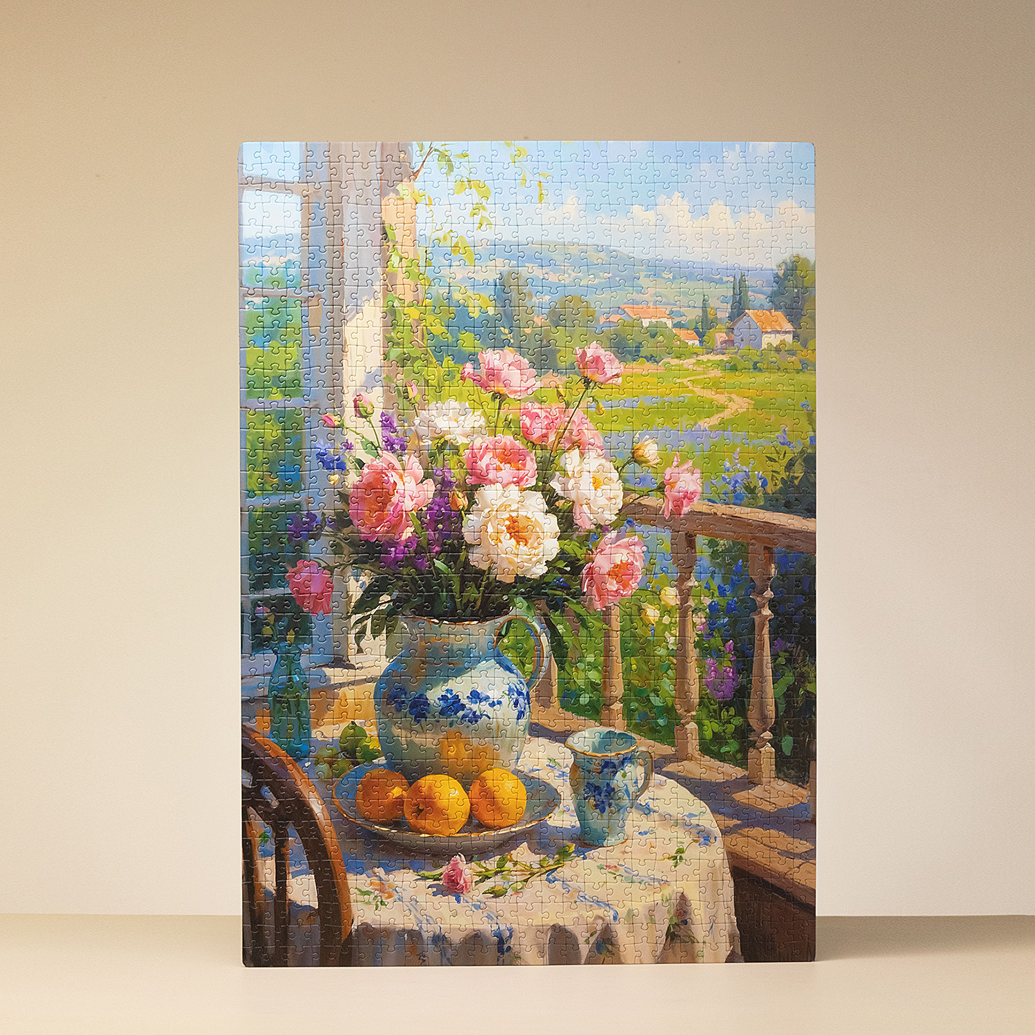 На иллюстрации стол на веранде: крупный букет садовых цветов в кувшине, фарфоровый чайник и чашка, несколько ярких фруктов и вид на летний деревенский пейзаж. Плотные мазки, живописная фактура и насыщенная палитра с переходами от нежных розовых и белых оттенков к глубоким зелёным и синим создают ощущение тёплого, солнечного дня. В композиции нет случайных деталей: каждый цветок, отблеск на посуде и фрагмент пейзажа добавляет объёма и делает картину похожей на репродукцию, которая органично смотрится в интерьере кухни или загородного дома.