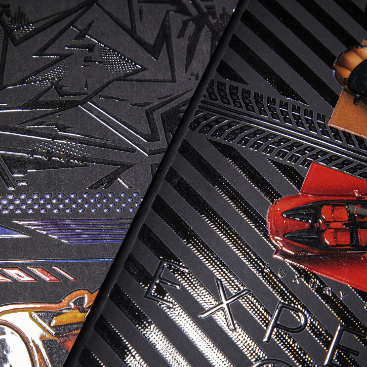 Индивидуальная стилистика дизайнов и объединяющий чёрный матовый фон с 3D лаком на акцентных элементах.
