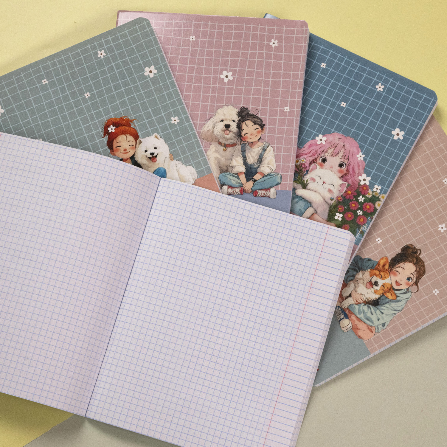 Нежные оттенки, приятный, немного анимешный стиль иллюстраций на фоне забавного клетчатого принта с цветочками.